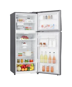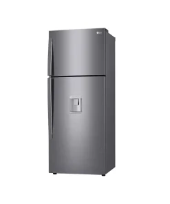 A spacious 438 L top-freezer refrigerator with a sleek platinum-silver finish, featuring LG’s energy-efficient Smart Inverter Linear Compressor, fast DoorCooling+™, multi-airflow system, Fresh-0 Zone, in-door auto ice maker, LED lighting, water dispenser, HygieneFresh+™ air filter, and SmartThinQ™ app control.